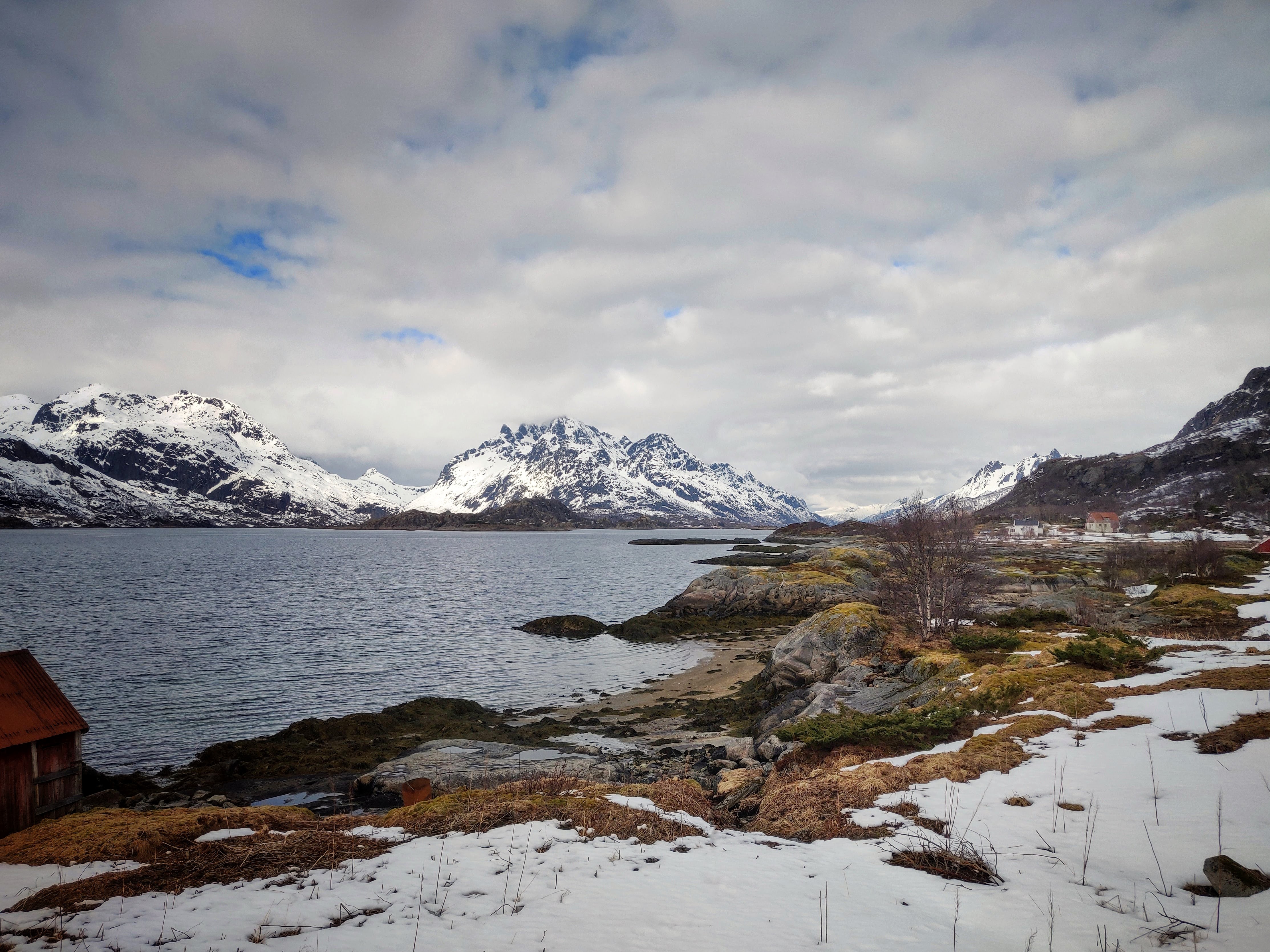 Summer 2023. Walking the dog in typical Norwegian scenery -A red boathouse by the sea.